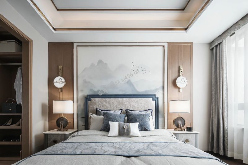 新中式风格132平米3居室卧室背景墙装修设计效果图