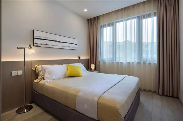 次卧简洁大方的床铺,床头两侧是一侧床头柜,一侧落地灯的布置。而木质护墙板做了藏灯处理,配合床头墙一幅隐逸味的黑白装饰画,也显得雅致温馨。