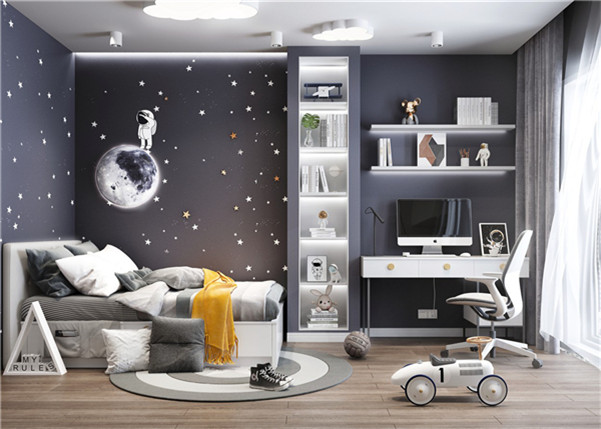 如果觉得纯色的墙面太单调,可以用星星、云朵、宇宙、飞机、几何线条等简单的元素来点缀。不要在儿童房张贴狰狞怪诞、好勇斗狠的图画,会对孩子形成潜移默化的影响,天长日久,会给他们的成长带来不利。