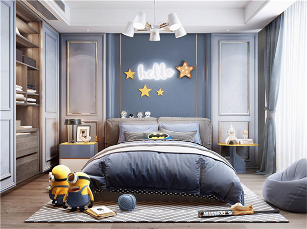 儿童房的空间不一定要大,但也不能太小。太大会显得空旷,会让孩子没有安全感;但太小又很容易形成一个密闭的环境,同样不利于孩子的身心健康。所以儿童房的空间一定要设置合理,空间大的就隔成多个空间,空间小的就减少屋内家具摆放,给房间空出留白的余地,让孩子尽情的发挥自己的想象力。
