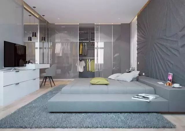 也可以利用床尾的位置设计成开放性衣帽间,简单的一个布帘或玻璃推拉门就能实现想拥有的衣帽间梦想。如果卧室空间不足以设置独立衣帽间,可以利用床头转角的位置做一个L型衣柜,收纳空间多了,看起来也很美观。