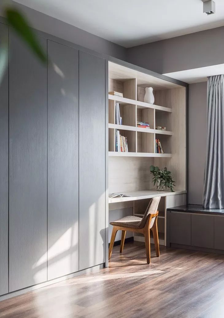 ▲书房的改变比较大,改造的时候拆掉了书房原始的墙体结构,作了进一步的延伸与客厅融合在一起形成统一的大空间,玻璃滑门作为隔断,又能把两个空间隔离开来。