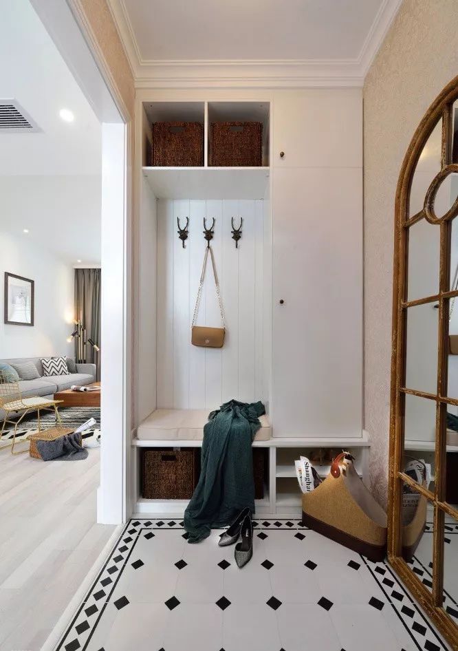 ▲ 玄关柜分为衣帽区与储物柜相结合,颜值与实力兼备。地面通过地砖与客厅地板区分开来,强调了玄关空间的整体性。