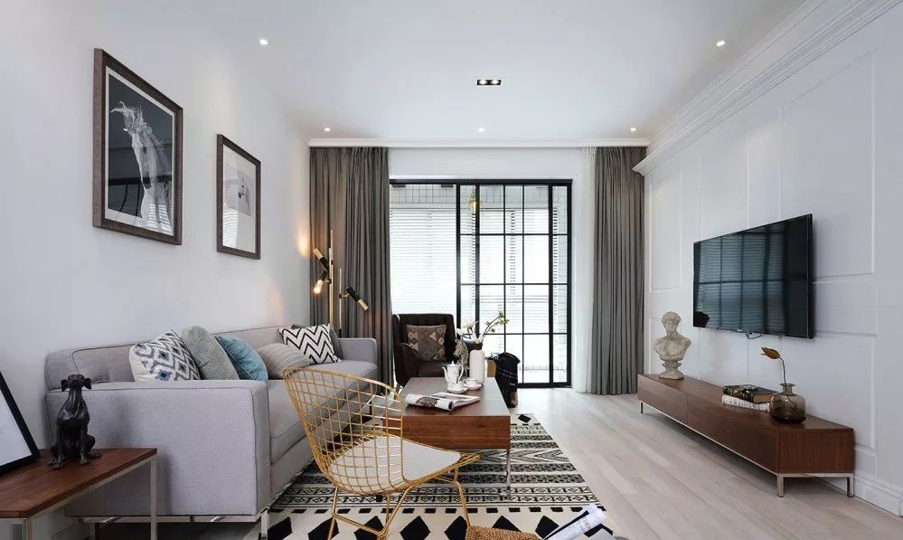▲ 客厅,家具的线条整体较为简单,极具北欧风格,浅淡的色彩给人以清爽的感觉。浅灰色的布艺沙发配上几何图案的抱枕、地毯,整体上舒适自然。木质茶几沉稳而有质感,充满情调的装饰摆件自然有格调。