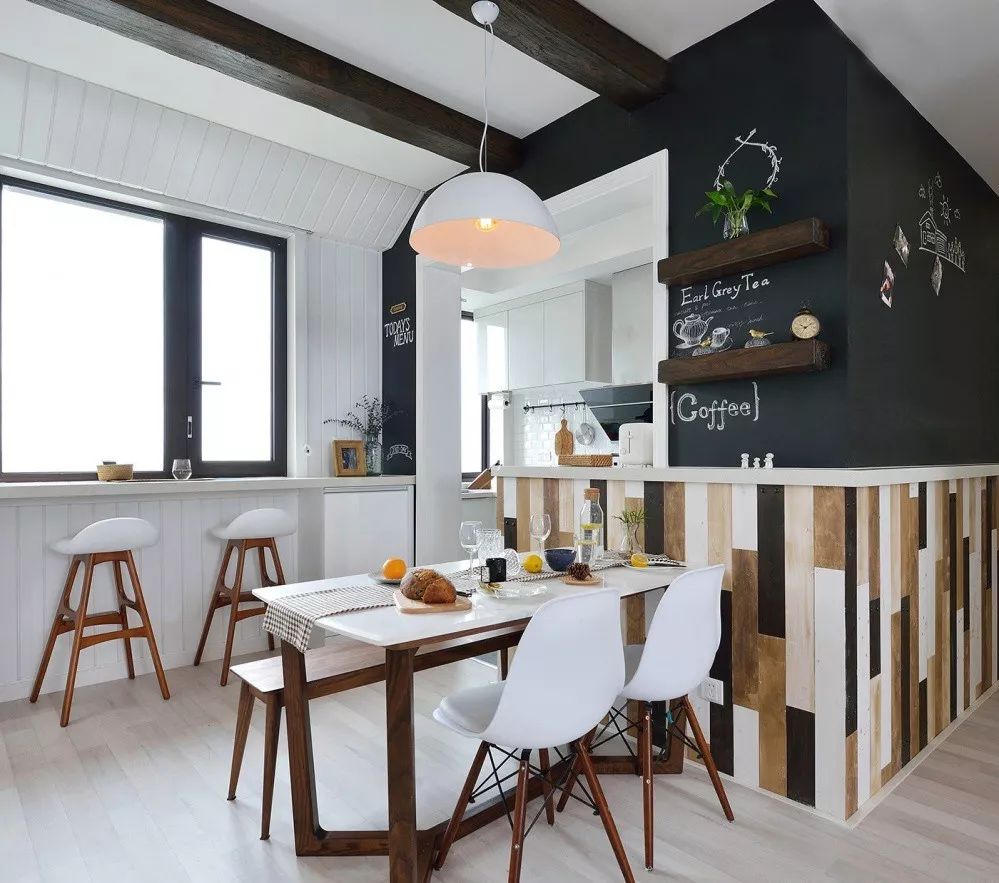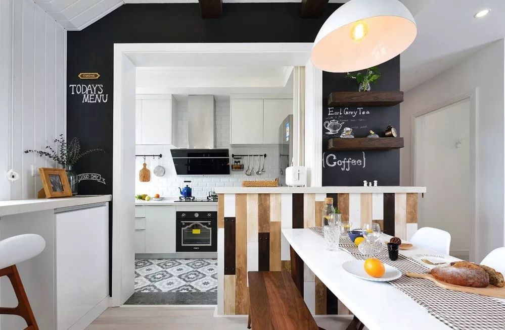 ▲ 餐桌和开放式厨房结合的形式,让平时只有一个人操作的厨房有了更多和家人互动的空间。木质桌脚加白色桌面的长形餐桌,呼应了整个空间,清新自然不乏艺术感。