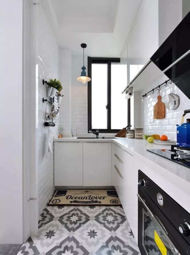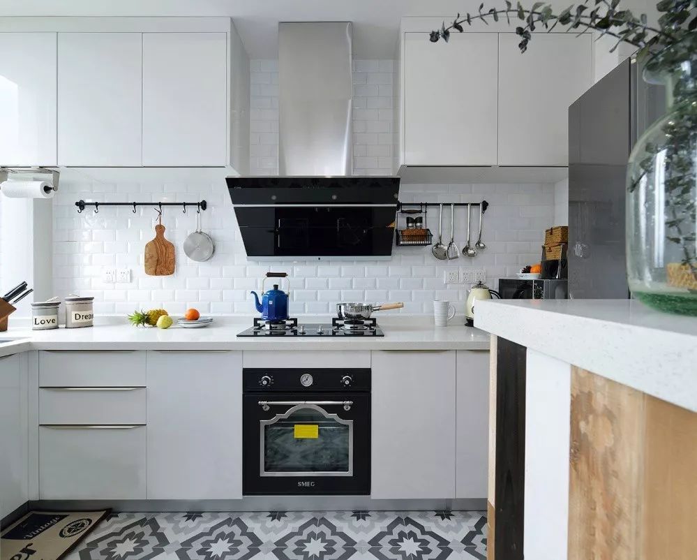 ▲ 厨房集美观与实用性于一体,白色的厨房永远都不用担心过时,整体清爽简洁。墙上悬挂着各种功能挂钩,方便日常使用,也让厨房布局更加有序。