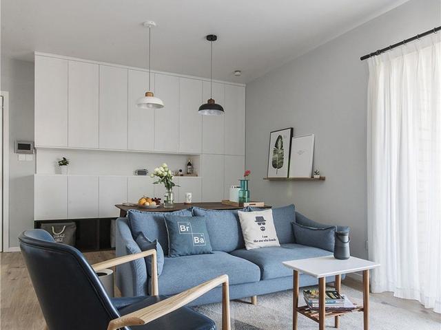 客厅后面就是餐厅,直接没有墙壁做隔断,这儿样的一体化布置,也显得空间更敞亮了。毕竟原本户型不大,所以这样进行空间的利用,也算是更合理了。后背墙壁打造一排的白色储物柜,可以实现杂物的收纳,餐桌椅的搭配,用餐也是很有小资的格调,餐厅装饰很清新简约。