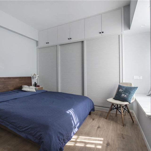 主卧的装修比较简单又休闲,墙壁是以浅灰色为主,搭配的是复古实木的双人床,显得空间很具有简约简洁的休闲感。靠墙的地方打造了一排的入墙式衣柜,这种白色的三门推拉衣柜,可以实现更多衣物的收纳。带有一个简单的休闲飘窗,显得室内采光效果也很好。