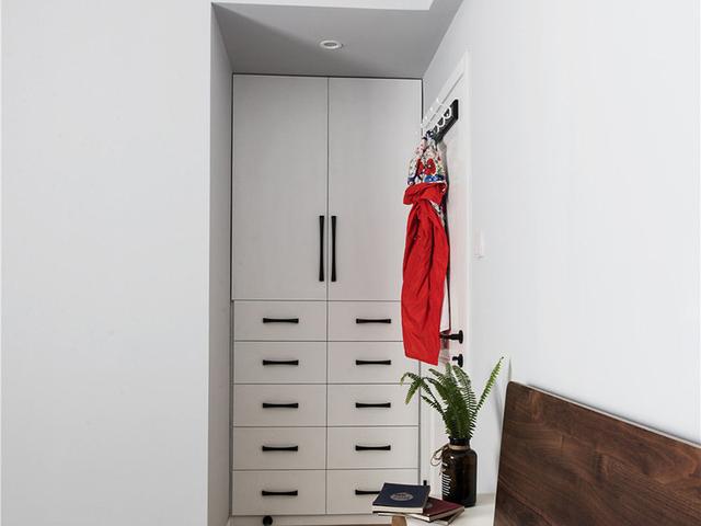 卧室带有一个拐弯的墙角,刚好内嵌式的打造了一个小的柜子,上面是双开门储物柜,下面是多层的小抽屉,这样的柜子可以实现卧室小物品的收纳。合理的进行角落空间的利用,实现了卧室的空间扩容,装出了比较实用的一面,一点也不会影响卧室的空间感。