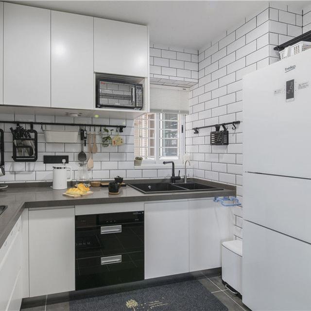 厨房的空间小,采用的是转角的设计方式,打造的是转角的白色的橱柜,可以满足我们多功能的收纳储物。吊柜也是到顶的设计,白色吊柜与地柜相互搭配,提高了卧室空间的利用率。刚好拐角的空间,落地式的摆放一套冰箱,这样搭配摆放也会更加的节省空间,以后烹饪会更便利。