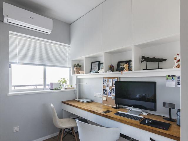 书房的空间面积不大,靠墙的地方设计了一排的到顶白色柜子,这种白色的柜子可以用力啊当做书架使用。搭配落地式的一体式书桌,可以满足双人办公的需求。装修简单采光效果好,空间布置的也很到位。让原本比较小的空间,发挥到了强大的用途。