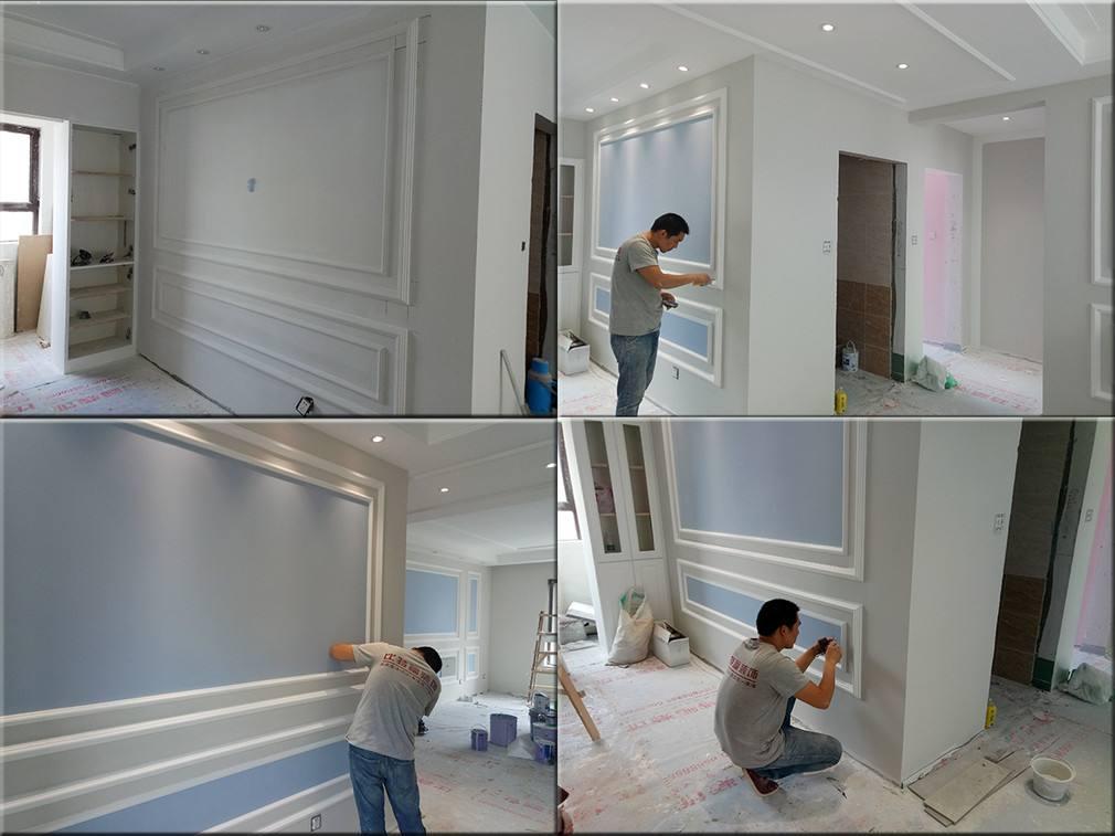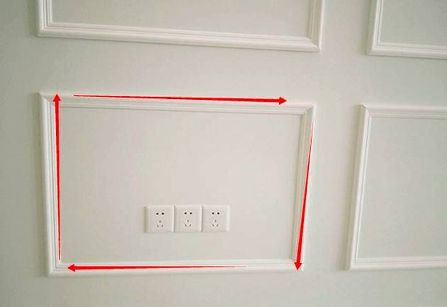 在后续实际贴的时候,用水平仪水平找齐之后,为了避免开关的位置,上下线框和腰线的间距,还需要根据自家的情况做些调整,不然在插座的地方,石膏线突然截断一部分得多丑。