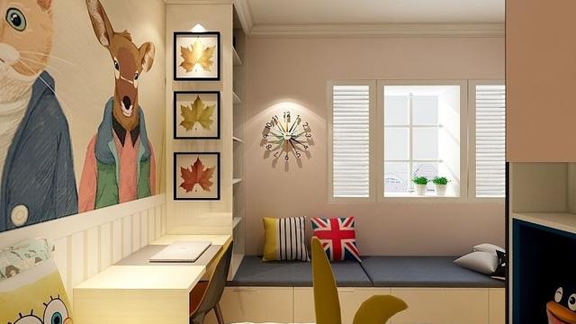 儿童房布局非常温馨可爱,墙壁上采用了这种浅咖色的格调,在灯光的映衬下,让卧室显得非常温馨舒适。榻榻米靠窗设计,有着丰富的储物格,能够将室内的物品很好的收纳起来,让卧室显得更加整齐有序。在书桌背景墙上还设计了两个卡通图案,让儿童房显得更加时尚有活力。