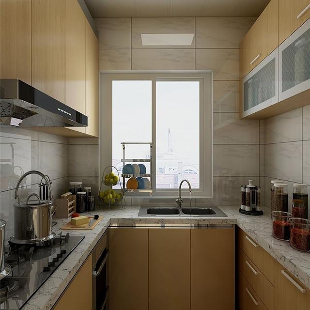 厨房的面积非常小,这样设计非常经典时尚,浅色的实木橱柜非常精致,呈U型摆放安装,搭配一组吊柜,能够将厨房的空间非常好的使用起来,能够在有限的空间里提供非常好的储物空间,能够将零散的厨具整齐的收纳起来,日常做饭拿取使用更加便利。