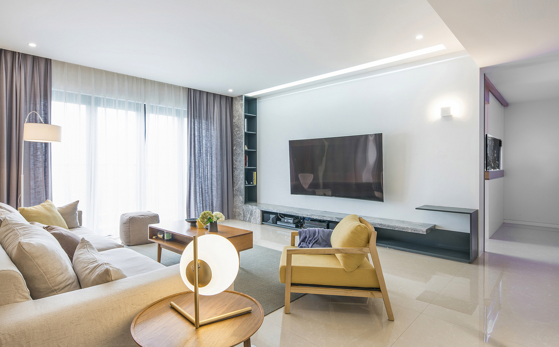 沙发跟电视的关系也能起到不小的作用。在装修背景墙前就要量好沙发的位置,省的到了后期才发现客厅尺寸的限制,达不到想要的效果。