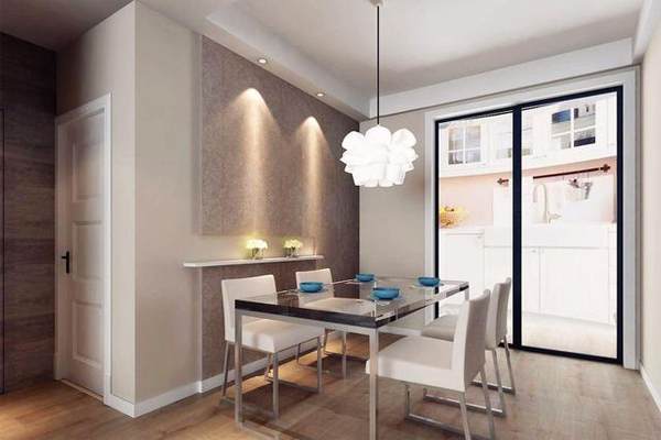 1、妙用颜色,如果你的餐厅靠近另一个居住空间。这时最好让两个空间用同样的颜色做主色调,再选择一些不同的,但接近主色调的小装饰点缀。比如说,采用拥有淡绿色花纹的台布,可以让餐厅的整体效果看起来非常和谐、活泼。