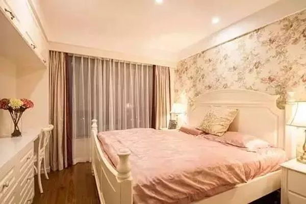 除了田园的小碎花作伴,小细节带来的装饰效果也非常不错。从床品到背景墙,暗纹为纯色勾勒出了不一样的光景。