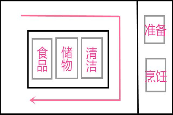 建议:依据右手习惯,从厨房进门,依次安放:食品储备区、厨具储存区、清洗区、准备区和烹饪区。