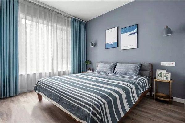 蓝色与灰色叠加,给主卧带来了一种沉静而又柔和的气氛。