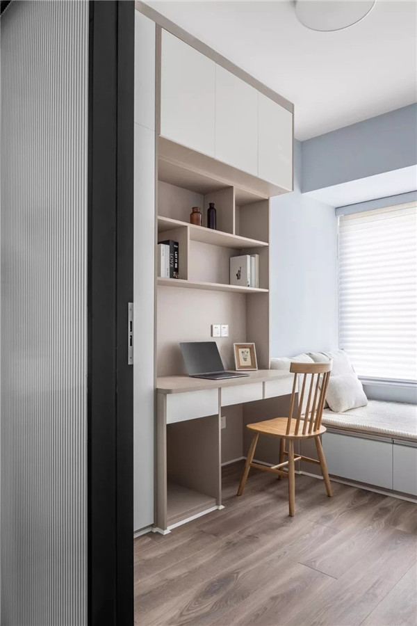 次卧作为独立书房兼客卧,采用长虹玻璃与客厅隔开。竖条纹压花玻璃自带一种美感,可以起到半遮挡的作用。