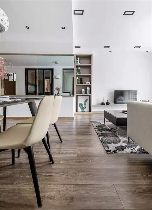 ◆有没有听说过木质地板是可以提升空间温度的?(真的不是心理作用!)冬天踩在木地板上绝对比在瓷砖上要温暖许多吧~再说木白两色拼接茶几和电视背景墙的装饰柜,收纳能力也是爆表,在餐厅的对面墙上还有一整面的镜子,视觉效果也很棒哦!