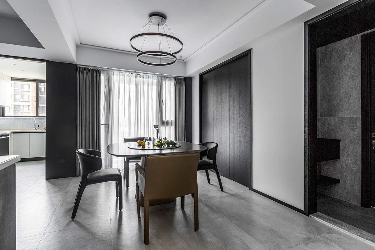家居的搭配上呼应空间的色彩调性,讲究简约而不失时尚的设计理念。温柔顺畅的暖灰色布艺沙发,搭配同色地毯,黑白两色的圆形茶几有序排列,风格独特的插画巧妙地缀于空间,为其增添生活温度。