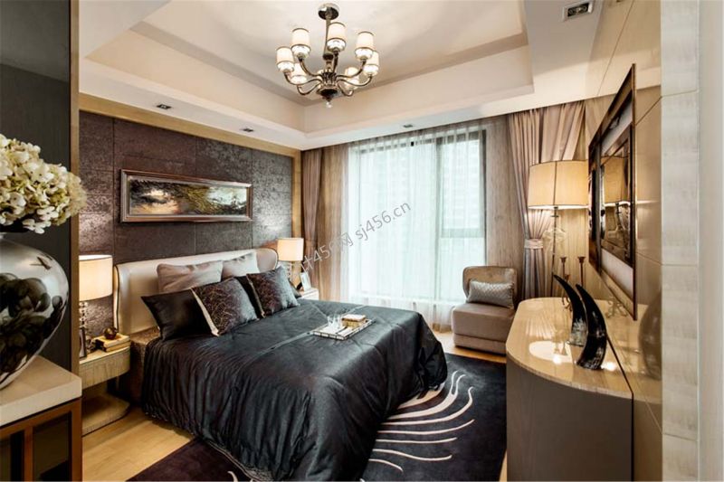 现代轻奢风115平米三室两厅卧室床头装修效果图