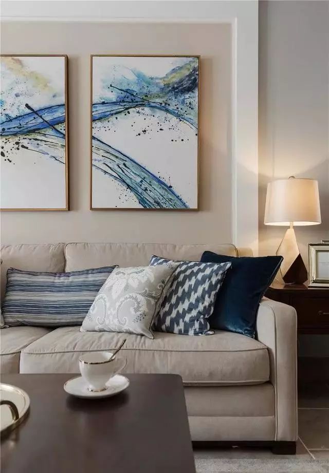 蓝色窗帘搭配蓝色装饰画,与蓝色抱枕相呼应,为沉静的客厅带来一丝活泼。