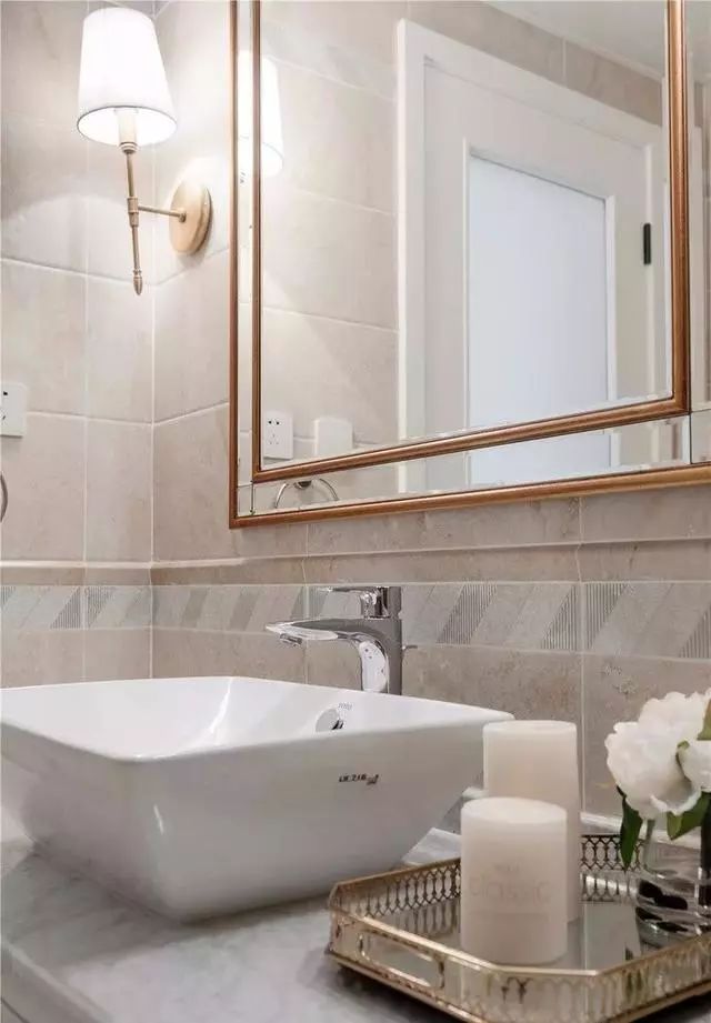 浴室以浅色为主,加上铜质边缘的浴镜,从视觉上扩大了卫生间的空间范围。