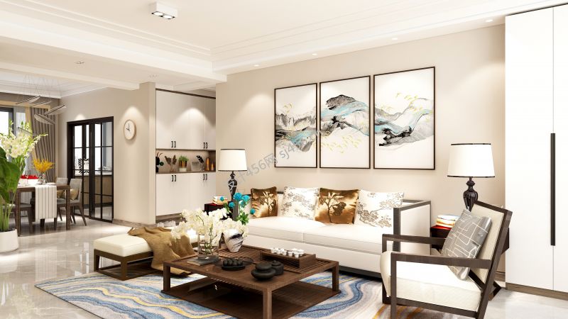 华鼎中央都会137平新中式风三居装修案例风效果图