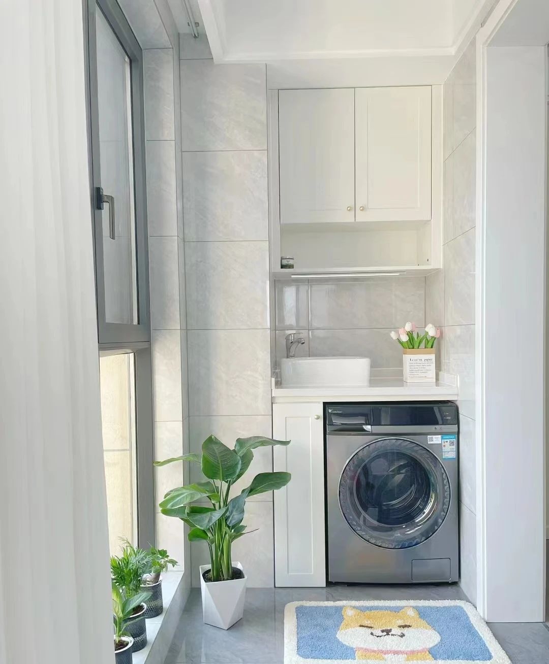 封闭式阳台,如果要涉及到洗衣服晒衣服,还是铺瓷砖比较保险。考虑到长期太阳直射,以及偶尔下雨忘记关窗这种情况的发生,无疑瓷砖是最不用担心的。