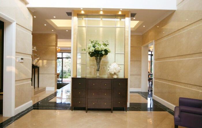 4、客厅玄关隔断好选择上面实心,防止外泄,上面以通透为主。因此可以用通透的磨砂玻璃或者空心的博古架之类的。玄关地面的材料要具备耐磨、易清洗的特点。