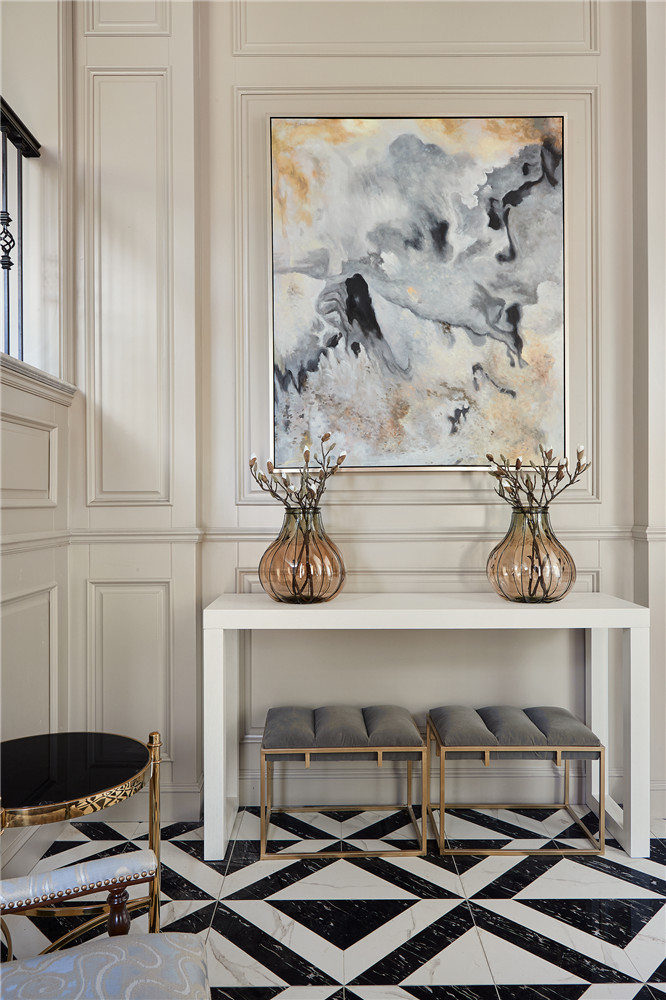 入户玄关地面的瓷砖选用黑白相间的大理石做装饰,考虑了成品的换鞋凳,方便屋主回家更换鞋子。玄关墙面上选用护墙板做装饰,墙面上挂了一幅特别出效果的画做装饰,不仅美观同时还比较出效果。
