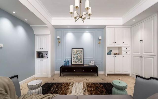 客厅以蓝灰色为寄到,搭配嵌入式白色储物柜,空间看起来优雅又温馨。