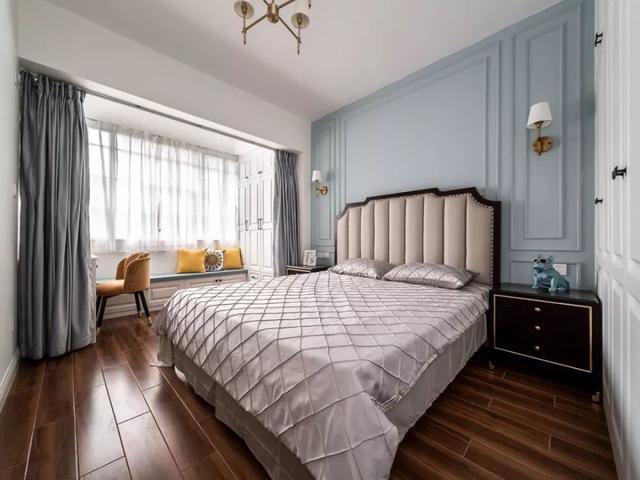 主卧用蓝灰色背景墙,加上石膏线和壁灯,优雅又精致。