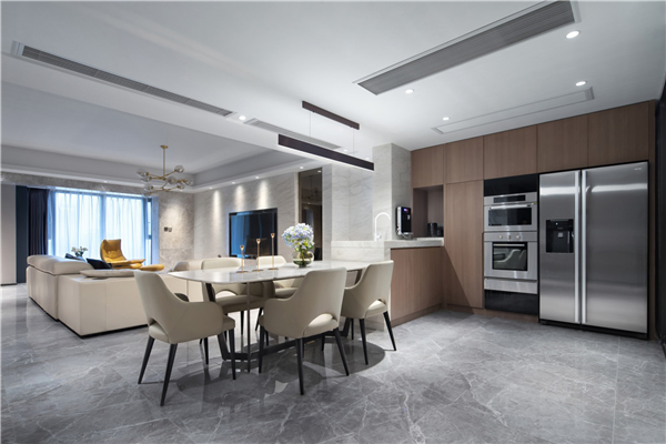 餐厅紧挨着大理石吧台, 冰箱从厨房外置出来,烤箱与消毒碗柜一起嵌入,与收纳柜形成一个简洁利落的整体。