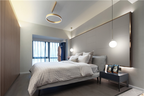 床头两旁的垂落的吊灯,设计简洁而独特,香槟色金属元素的搭配,是恰到好处的点缀。