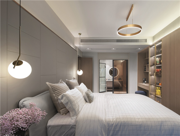 主卧室依然延续“简洁艺术”的调调,简约黑白灰与木色的搭配,营造一个轻松愉悦又充满质感的休憩空间。
