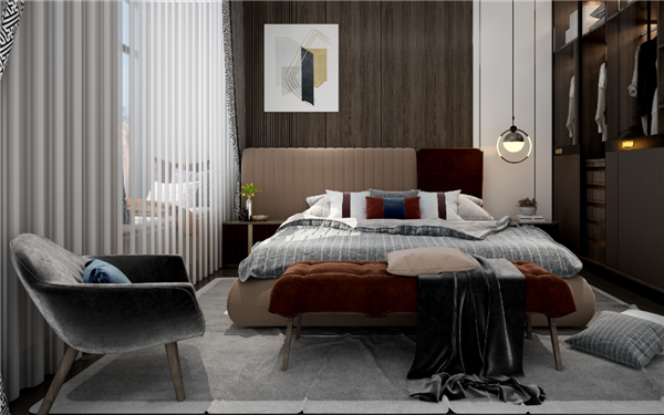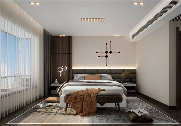 主卧室设计简雅舒适,具体通过深浅互补的色彩,柔和有致的灯光,明朗的布局,高端的软装等来提升居住的舒适性。