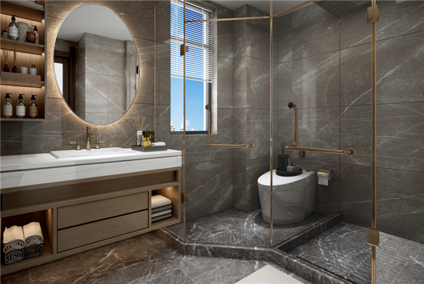 三分式的卫浴间,更具人性化的设计。干湿分离,独立淋浴间,保持镜柜收纳区干燥,独立马桶区,加强通风减少异味。