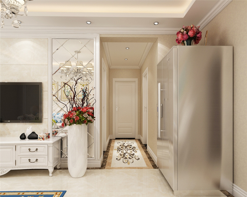 影视墙中间使用米色瓷砖和整体设计效果统一,两侧是车边境,从视觉上增加室内面积,更显通透敞亮。角落里红色的花朵优雅动人,魅力十足!