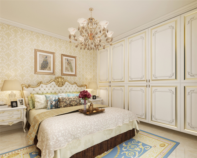 09-21全屋设计,米色系大马士革壁纸搭配恰到好处的灯光、家具颜色、挂画装饰,全屋散发着品位不俗的格调与优雅。地毯的蓝色,与抱枕和装饰画呼应。