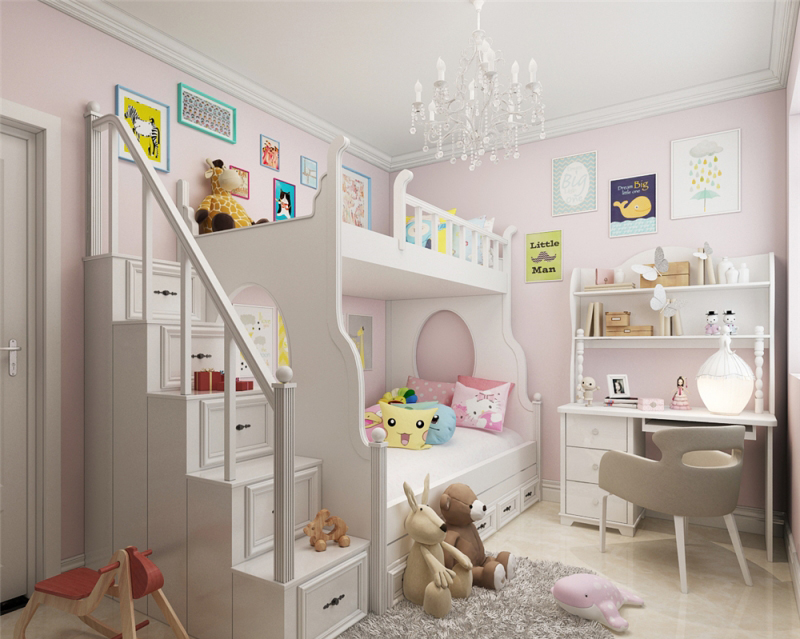 阳光力天装饰设计师结合了孩子的年龄、性格特点将房间粉刷成粉色,搭配白色家具,满足了小女孩的公主梦,上下床很适合小孩子使用。