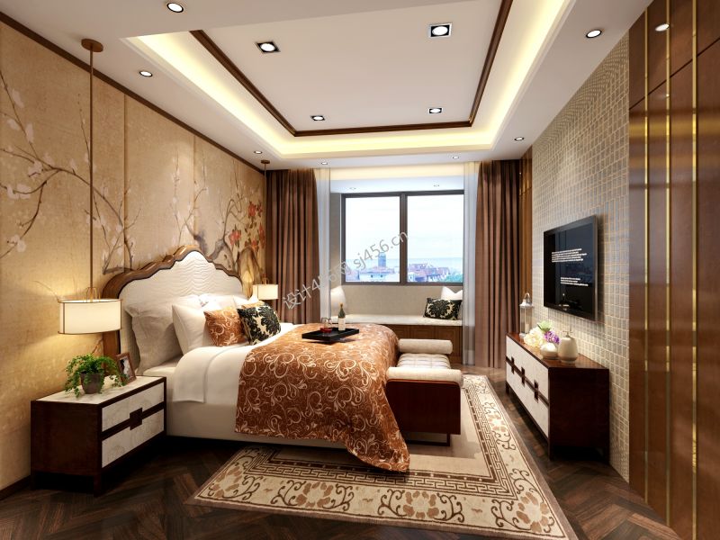 中式风228平米别墅卧室背景墙装修效果图