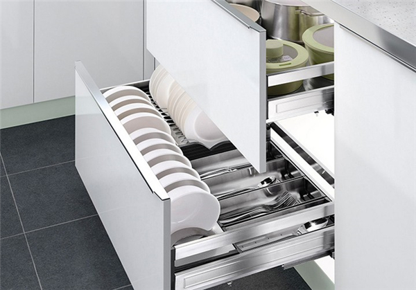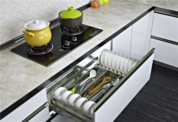 2、在操作时,要将抽屉和碗柜拉篮尽量往下装,这样不但可以装更多的东西,而且还方便使用。此外,要将拉手装在中间,若装高了,抽拉时使不上劲。