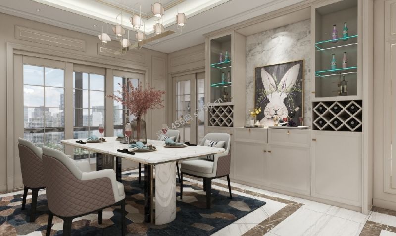 轻奢风格135平米餐厅背景墙酒柜装修效果图