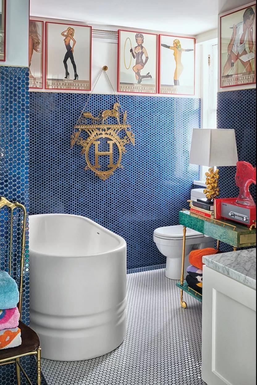 乔纳森·阿德勒(Jonathan Adler)选择把爱马仕(Hermès)精品店里的纪念章和一系列复古女性肖像作搭配,以用作他在West Village家中的主浴室装饰。