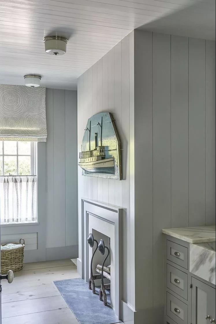 在欧洲发现的木制船艺术品,装饰着经过修复的长岛农舍中粉刷成白色的浴室墙壁。