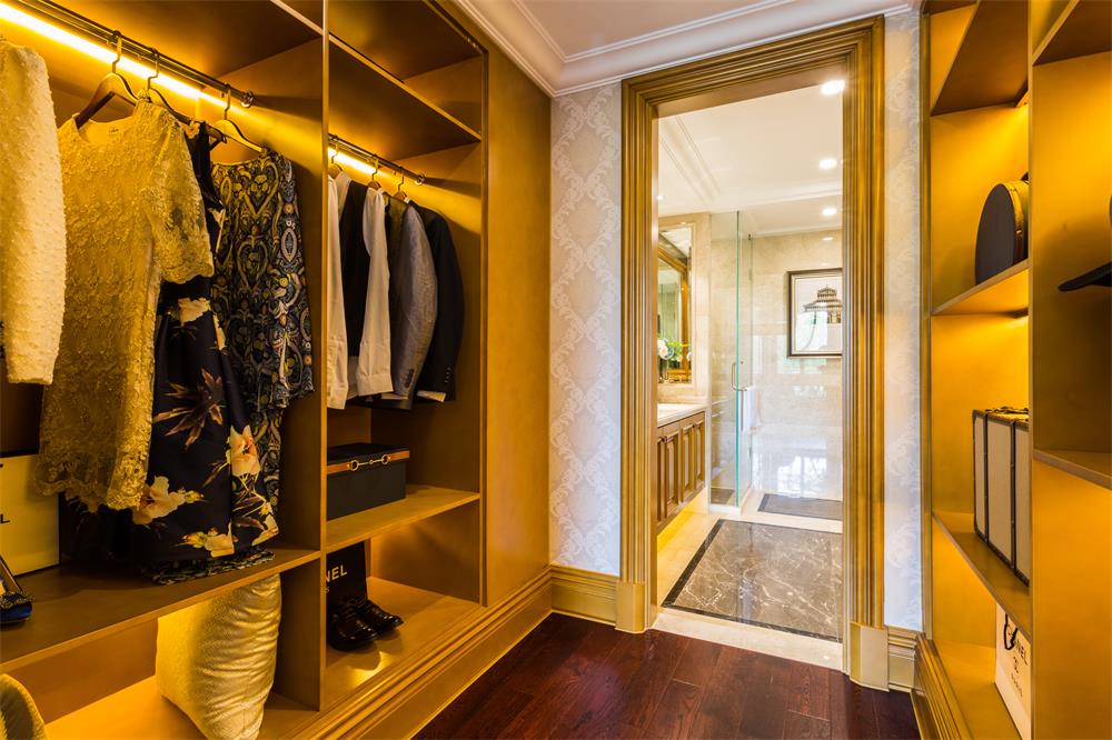 将床安排在房屋的中央,而不是千篇一律的靠墙摆放。床后设置衣柜和梳妆台等(可以理解为一个完整的衣帽间的配置)。床的话可以选择大尺寸king-size或者更大的,床头有较高的靠板。