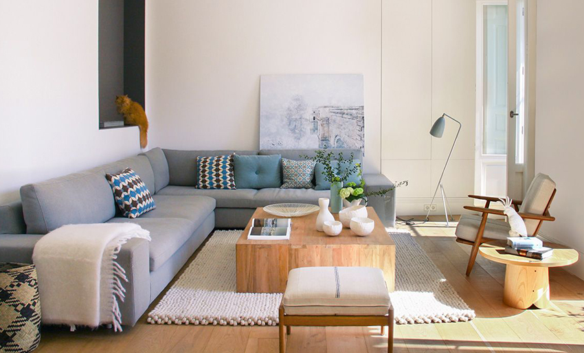 客厅采用麻质沙发、纯木家具单品搭配自然材质地毯,传达出一种自然、真实的朴素美。白色空间配以灰色家具,淡蓝色抱枕和茶几上黄色的小花点缀着清新纯净的环境。